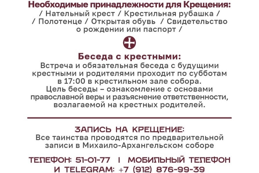 Записаться на крещение и получить дополнительную информацию можно по телефонам: +7 (912) 876-99-39, 51-01-77