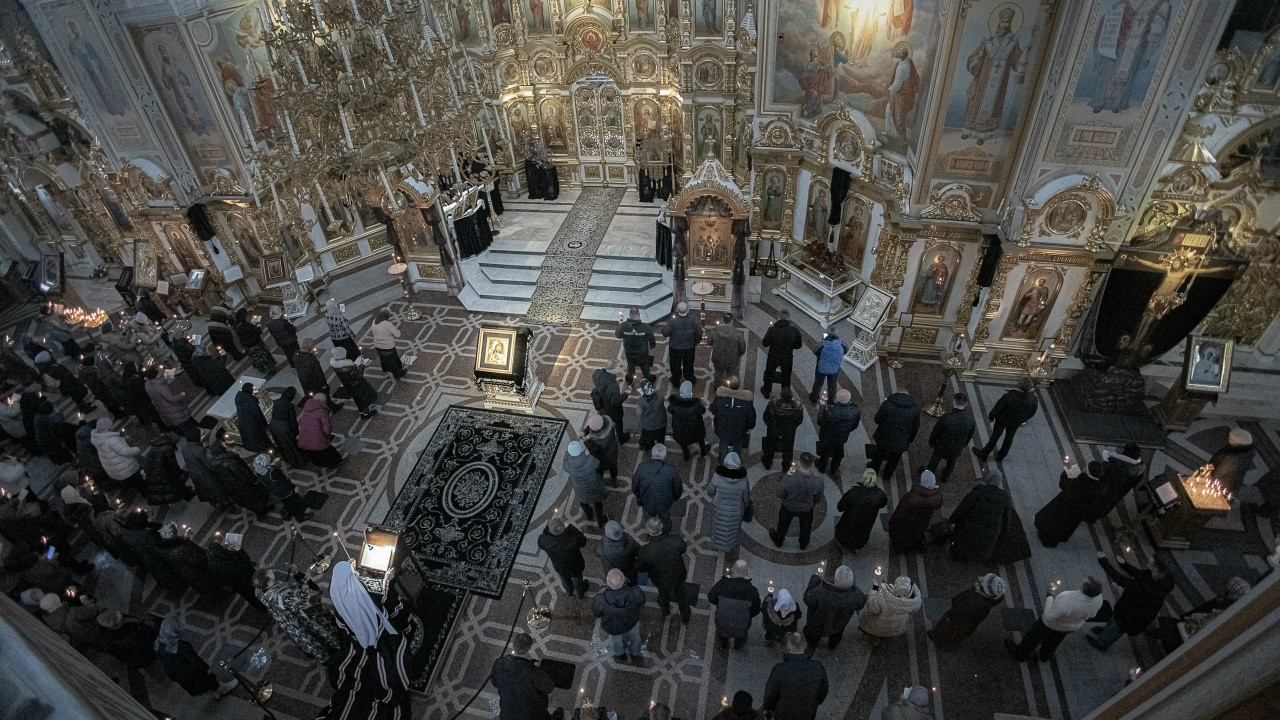 Песнопения исполняет хор духовенства Михаило-Архангельского кафедрального собора.